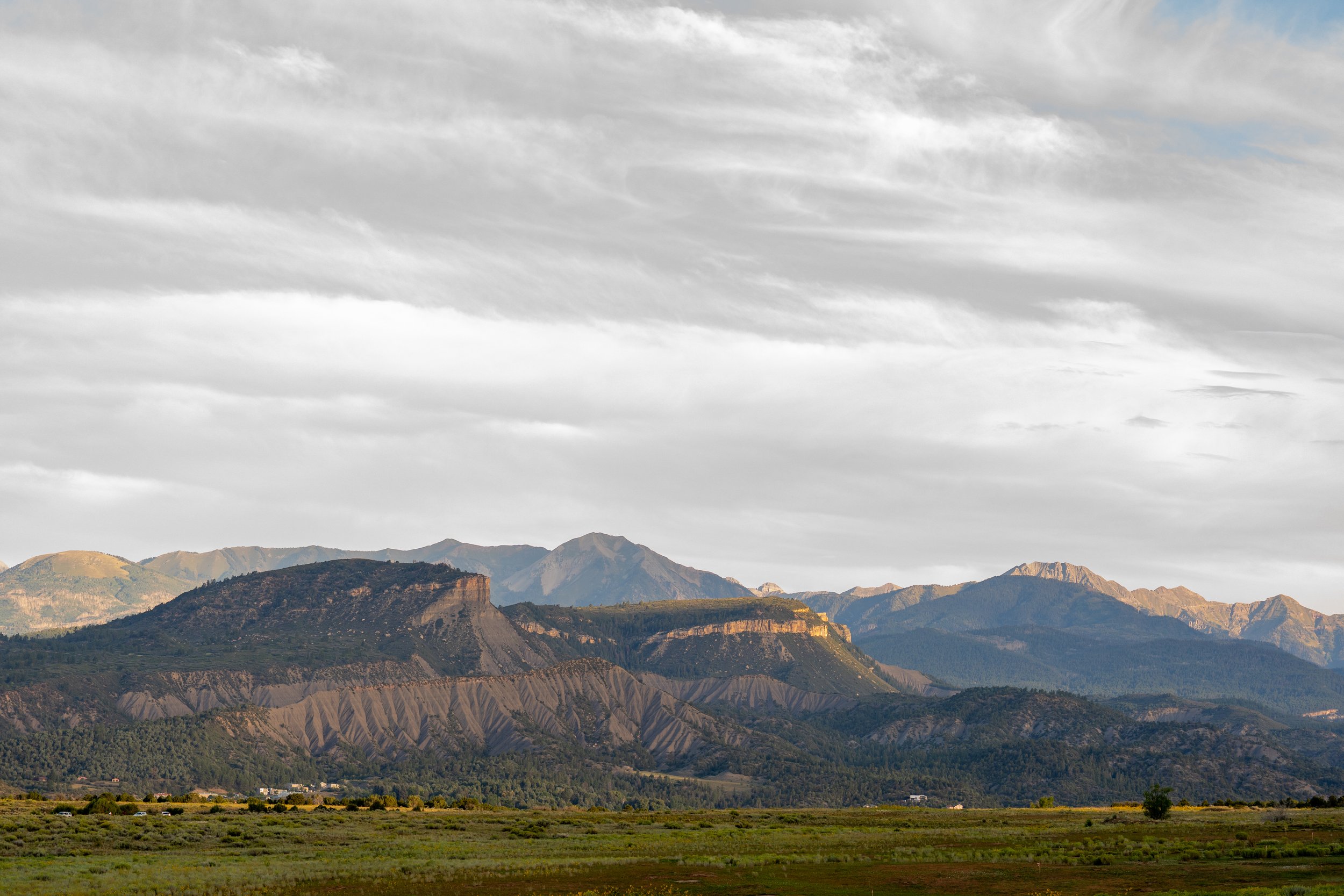 Mountain landscape with layered hills and mountains under a cloudy sky.